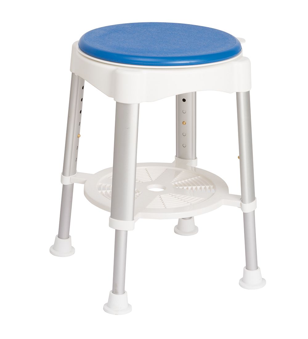 Der runde Duschhockermit Soft-Drehsitz und Ablage ist höhenverstellbar und unterstützt Sie hilfreich bei Bewegungseinschränkung während der täglichen Hygiene in der Dusche oder vor dem Waschbecken.
