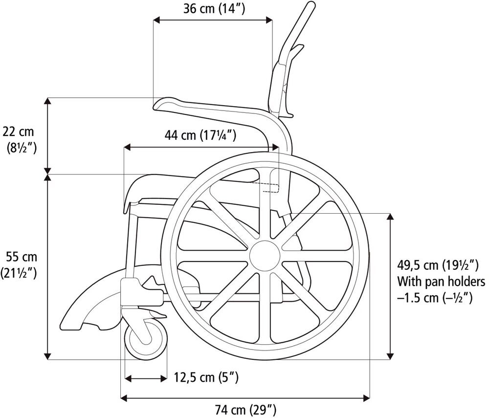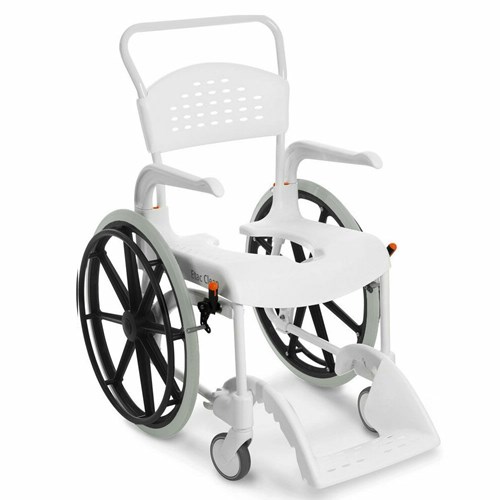 - Dusch- und Toilettenrollstuhl Etac Clean als Selbstfahrer mit 24 Zoll Antriebsrädern und einer Sitzhöhe von 55 cm