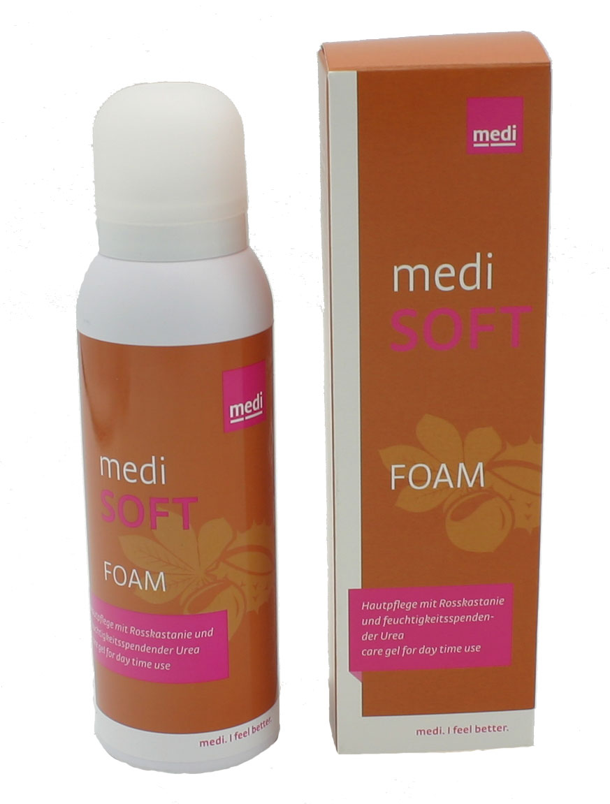 Die feuchtigkeitsspendende Hautpflege medi soft Pflegeschaum für trockene Haut mit Rosskastanie festigt die Gefäßwand und 10 % Urea macht Ihre Haut glatt und geschmeidig. Der Schaum zieht schnell und vollständig ein. Gibt Kompressionsstrümpfen mit Haftband zusätzlichen Halt. Einfach morgens oder abends auftragen und die Haut mit extra Feuchtigkeit verwöhnen.