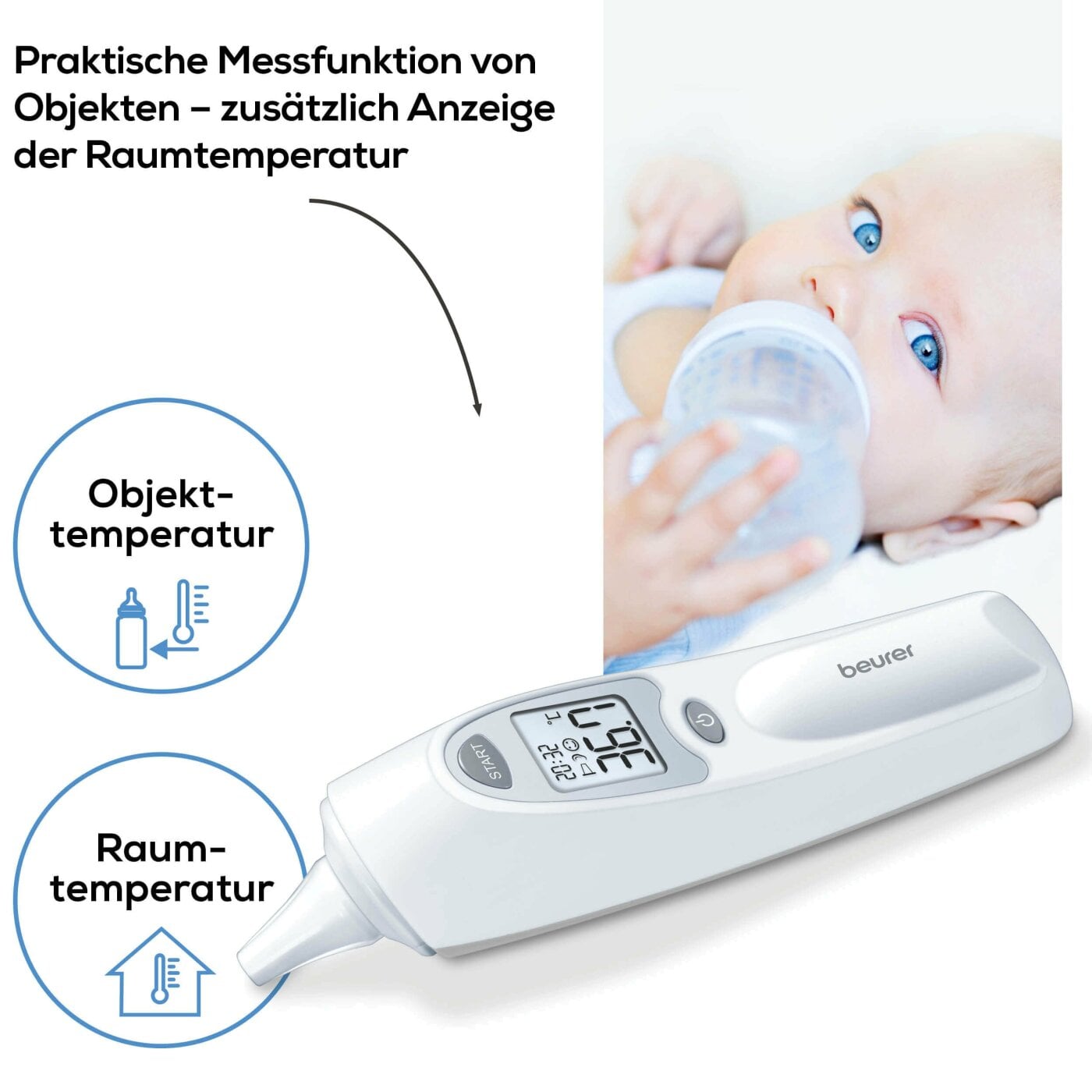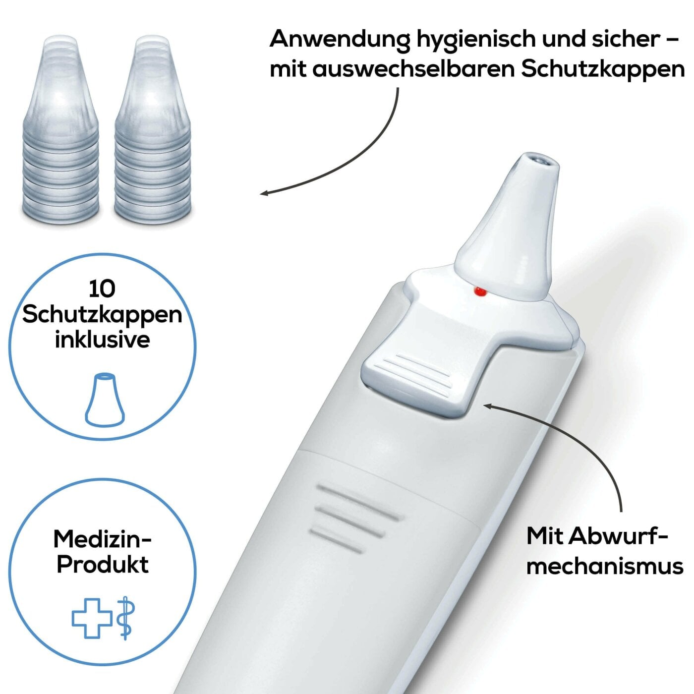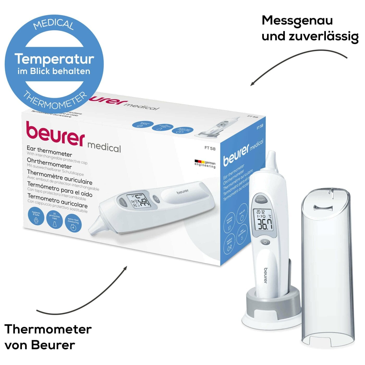 Das Beurer Ohrthermometer FT 58 eignet sich perfekt für hygienisches und sicheres Messen der Körpertemperatur. Zum hygienischen Messen mit dem Fieberthermometer liegen 10 Schutzkappen bei. Außerdem kann ebenfalls die Objekttemperatur eines Gegenstandes bestimmt werden.
