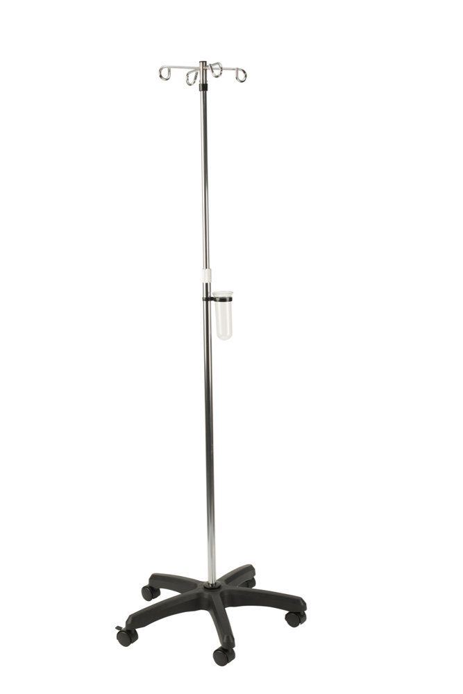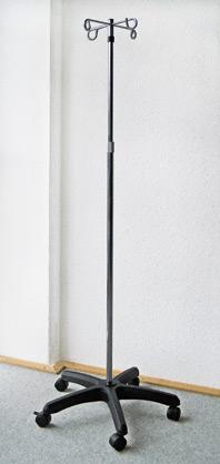 Der höhenverstellbare Infusionständer für Schwerkraftinfusionen kann auf jedem Haken des Flaschenkreuzes Flüssigkeit bis 1,5 Liter aufnehmen. Die Lieferung erfolgt ohne Abtropfglas und Halterung.