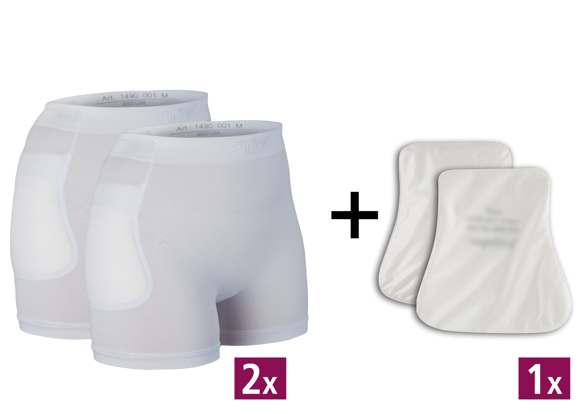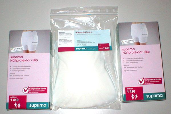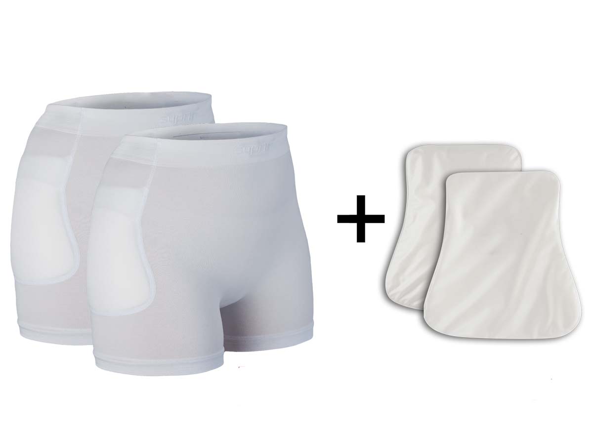 Das Hüftprotektorset Suprima enthält 2 Hüftprotektoren-Slips und 1 Paar Hüftprotektoren, die Brüchen bei Sturz vorbeugen.