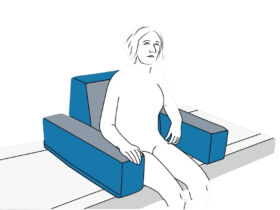 Mithilfe des Bettsessels ist es dem Patienten möglich sicher aufrecht wie auf einem Stuhl zu sitzen und die Beine außerhalb des Bettes zu haben. In dieser querbett, sitzenden Position wird der Patient durch die Anwendung des u-förmigen Bettsessels aktiv unterstützt, indem das massive Rückenteil den Patientenrumpf nach hinten sicher abstützt und den Patienten zusätzlich seitlichen Halt und Sicherheit über die breiten Armauflagen erhält.