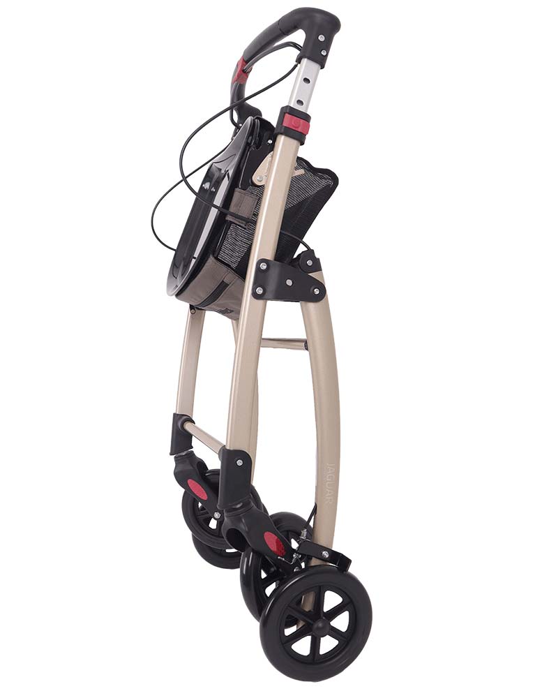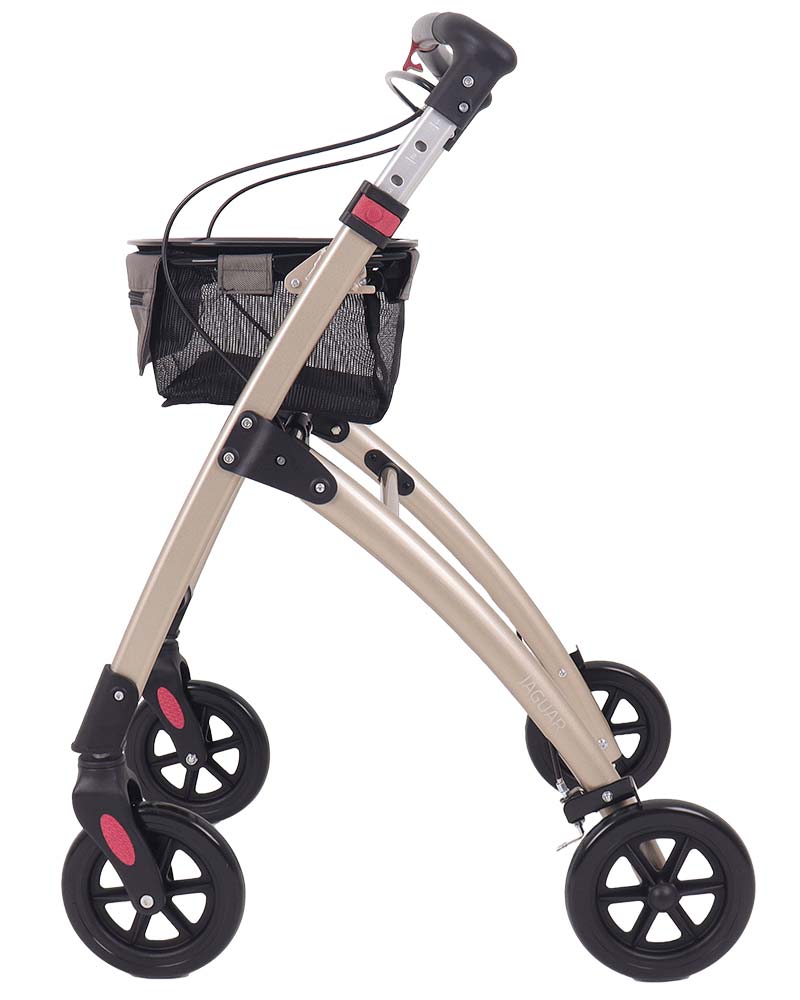 - Ein Mobilex Jaguar Indoor Rollator in champagner oder orange wird inklusive Korb und Tablett geliefert.