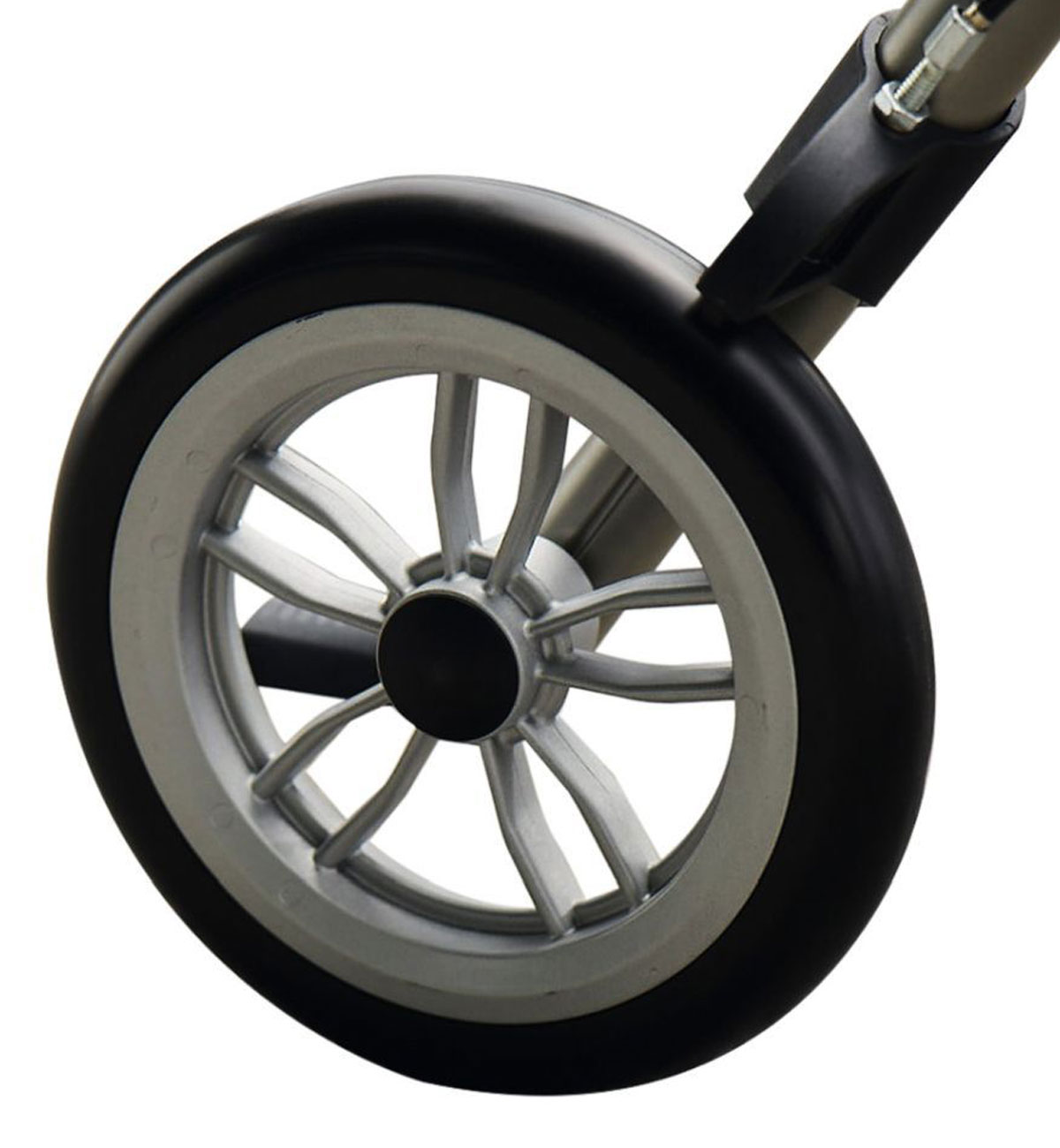 - Am Rahmen auf Höhe der beiden Hinterräder befinden sich Ankipphilfen, mit denen Sie Schwellen und Bordsteinkanten leichter überwinden können, ohne den Rollator anheben zu müssen.