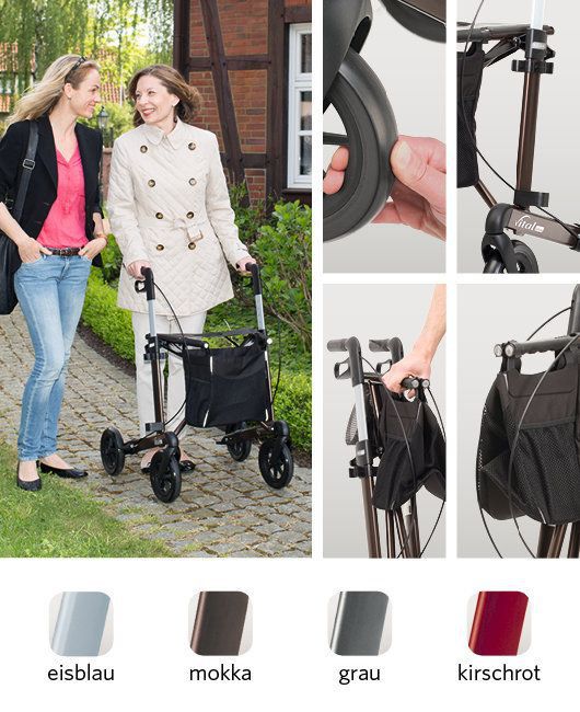 - In den Rahmenfarben kirschrot, eisblau, grau oder mokka wird der Rollator Vital Plus in den zwei Sitzhöhen 54 cm und 62 angeboten.