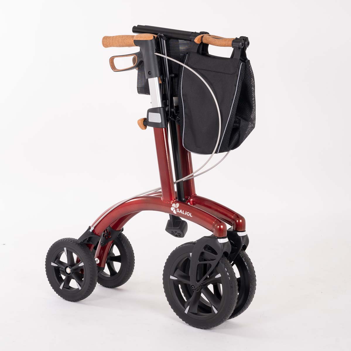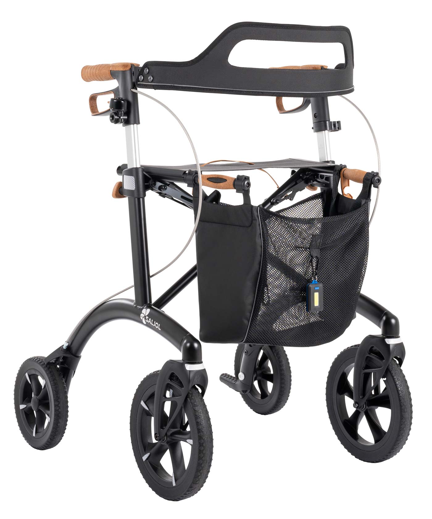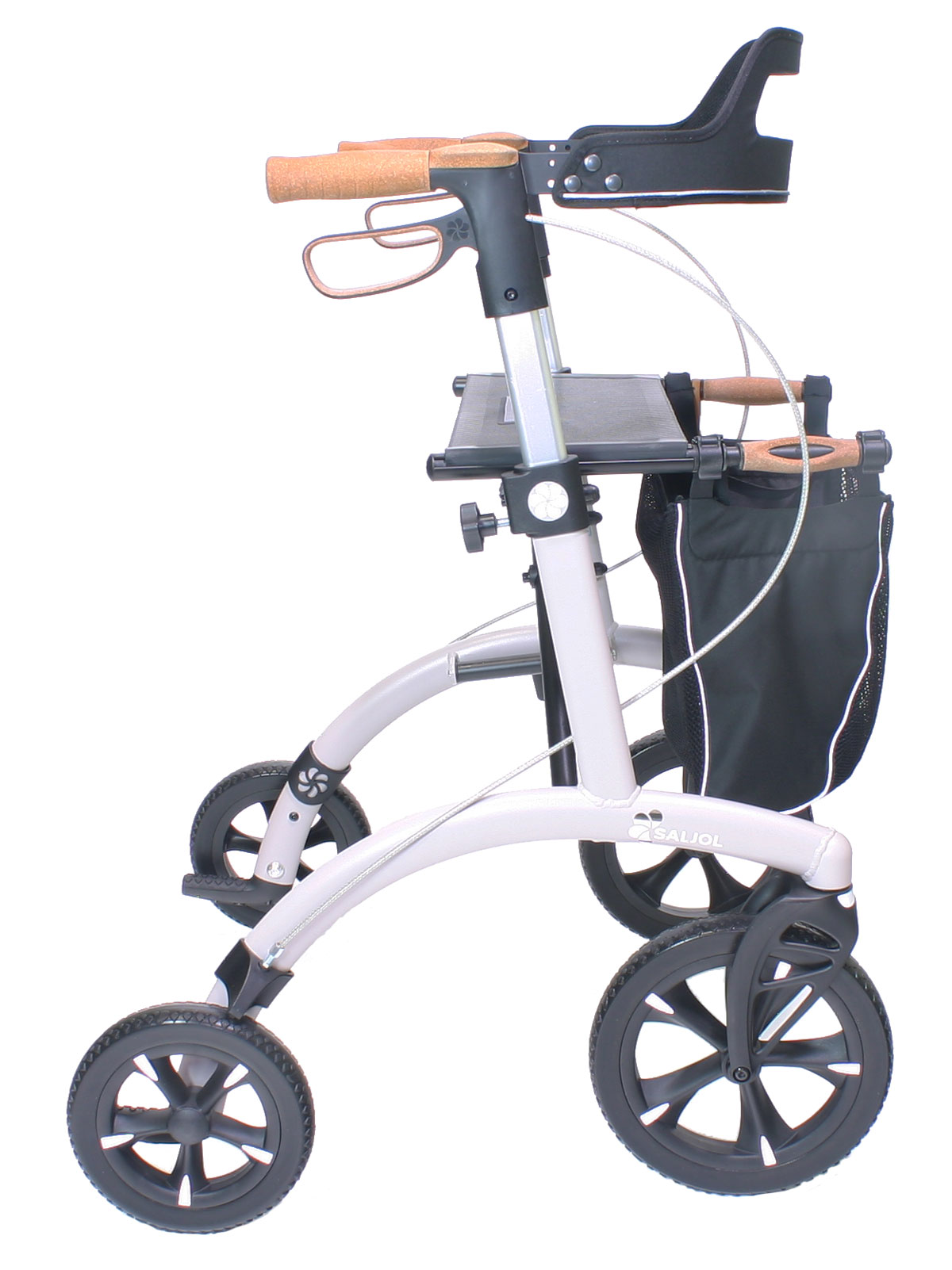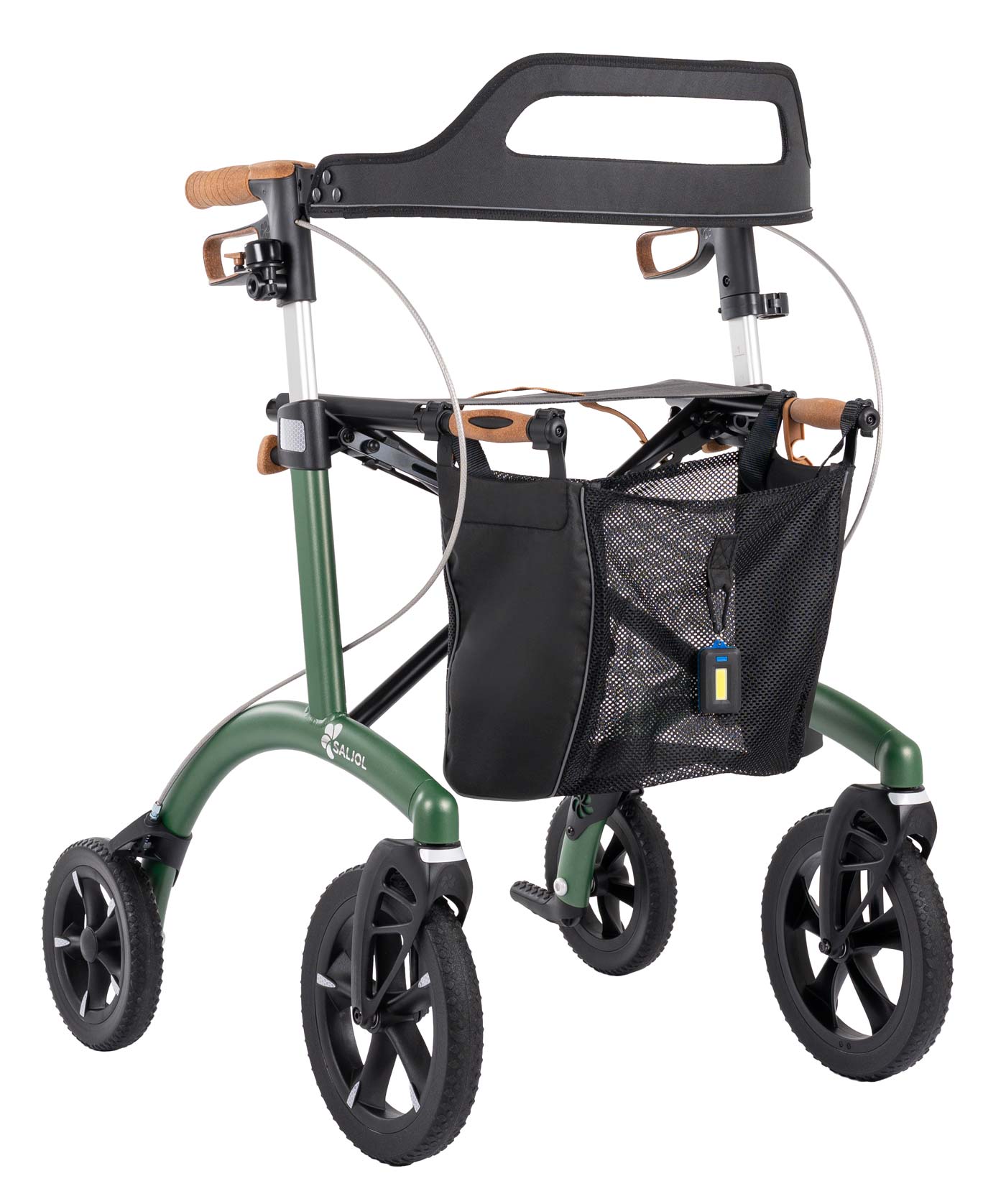 - Wenn Sie den Saljol Allround Rollator Pearl Grey, Barolo Red, Forest Green oder Magic Black kaufen, wird dieser inklusive abnehmbarem Rückengurt, Stockhalter, Klingel, LED und Einkaufsnetz geliefert.
