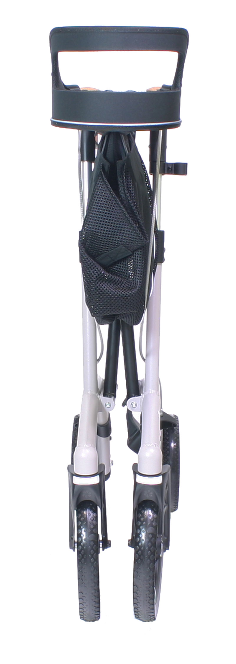 Der Outdoor Rollator Saljol Allround mit den großen Vorderrädern lässt sich schmal längs zusammenklappen und mit dem Verschlusshaken an den Befestigungsstangen des Netzes sichern.