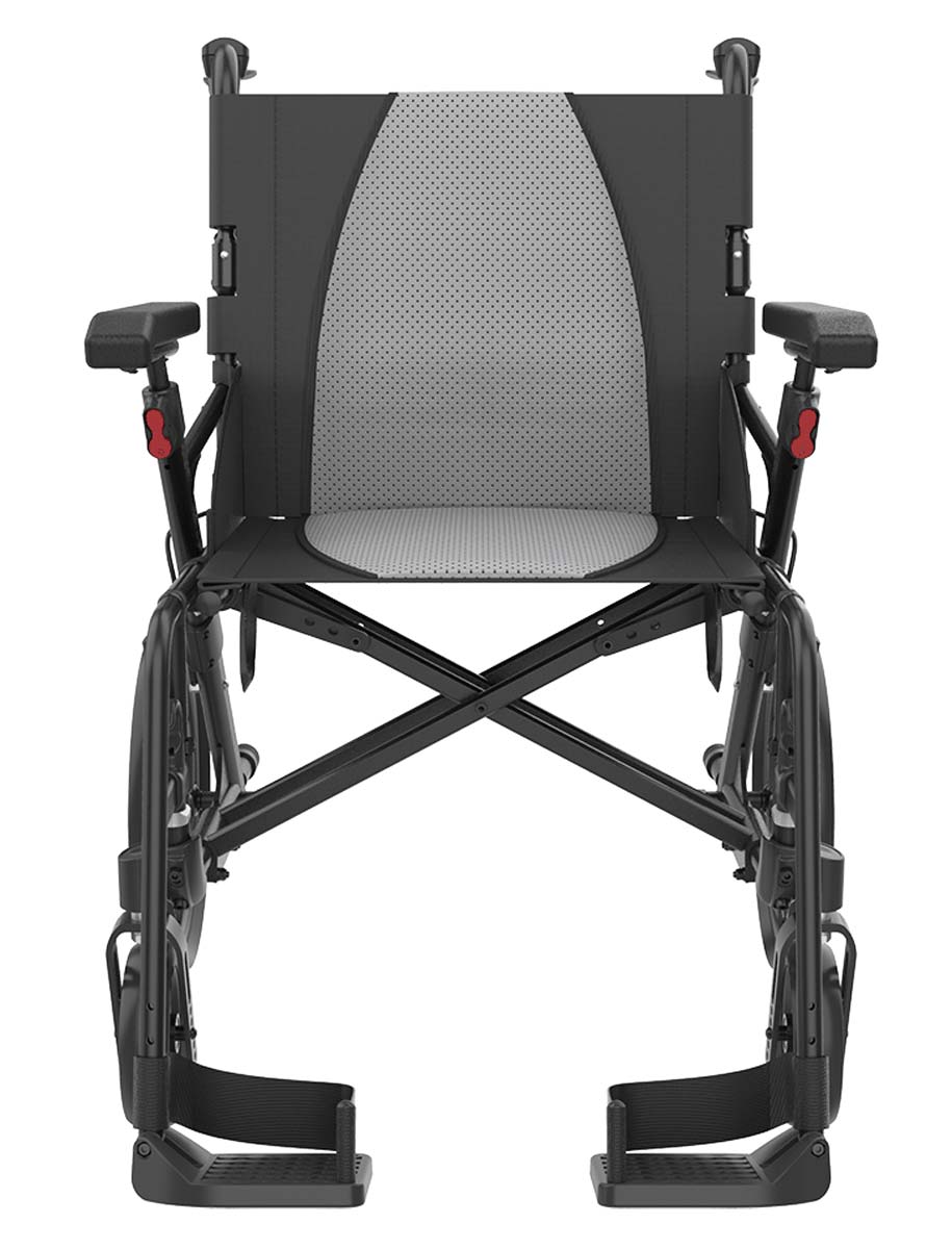 Der Transportrollstuhl ICON 35LX ist ausgestattet mit höhenverstellbaren Armlehnen, extrakomfortabler Mesh-Polsterung, 14 Zoll großen Hinterrädern aus weichem PUR und einem einklappbares Rückenteil zum platzsparenden Verstauen. Mit seinem eisblauen Aluminiumrahmen wiegt der leichte Rollstuhl ohne Fußstützen nur 9,0 kg. Nutzbar als reiner leichter Schieberollstuhl mit einer Griffhöhe von 91 cm verfügt er über eine praktische weiche Bereifung. Dank der vorne 7 Zoll (ca. 18 cm) und hinten 14 Zoll (ca. 36 cm) großen PUR-Räder lässt sich der Icon 35LX Transportrollstuhl besonders klein verstauen.